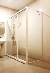 (Bergen Series) L-Shape 1 fix 2 sliding framed system with white frame _ 4mm clear tempered glass shower screen Leave a Comment / By Artilux / December 21, 2023